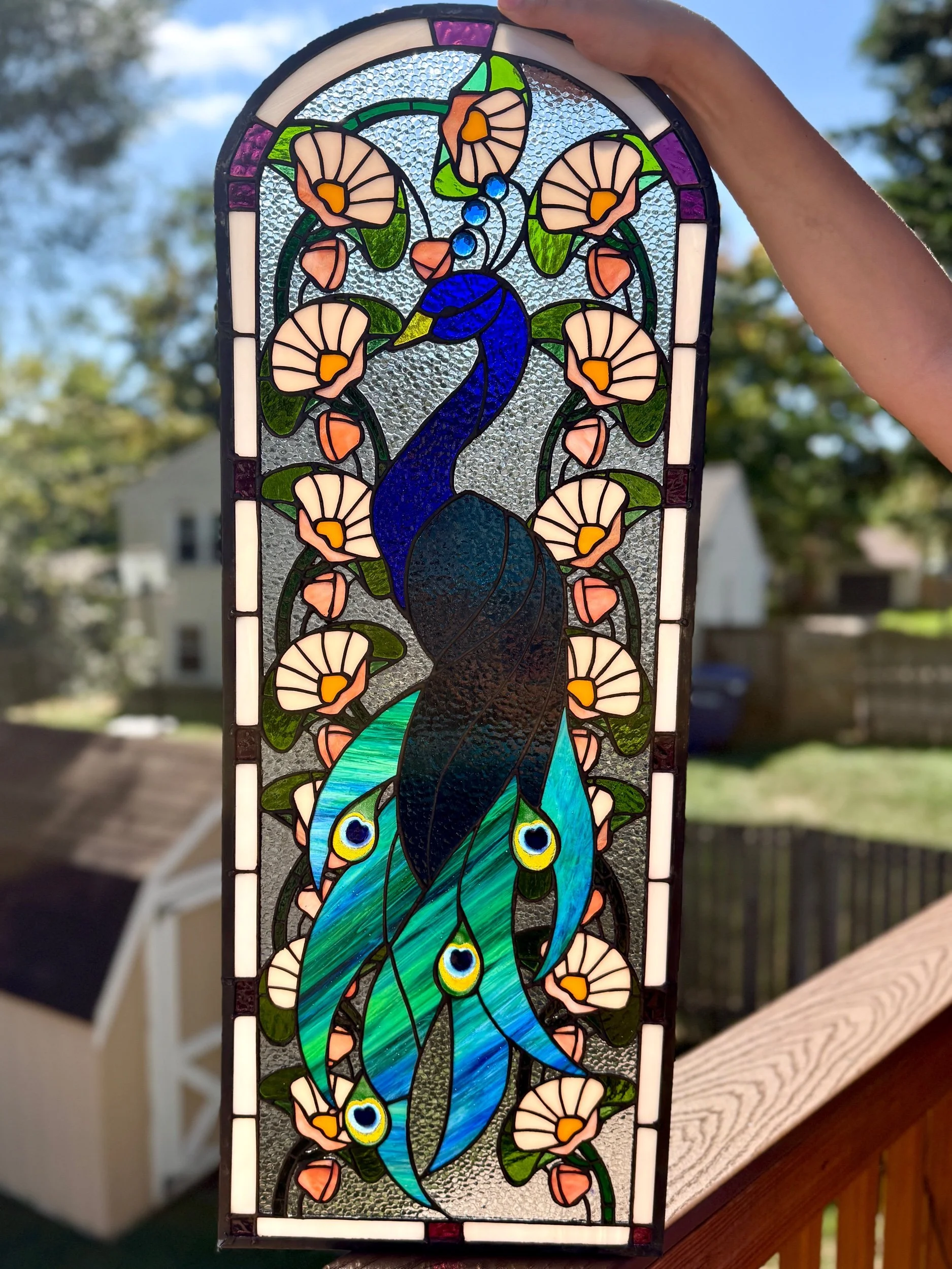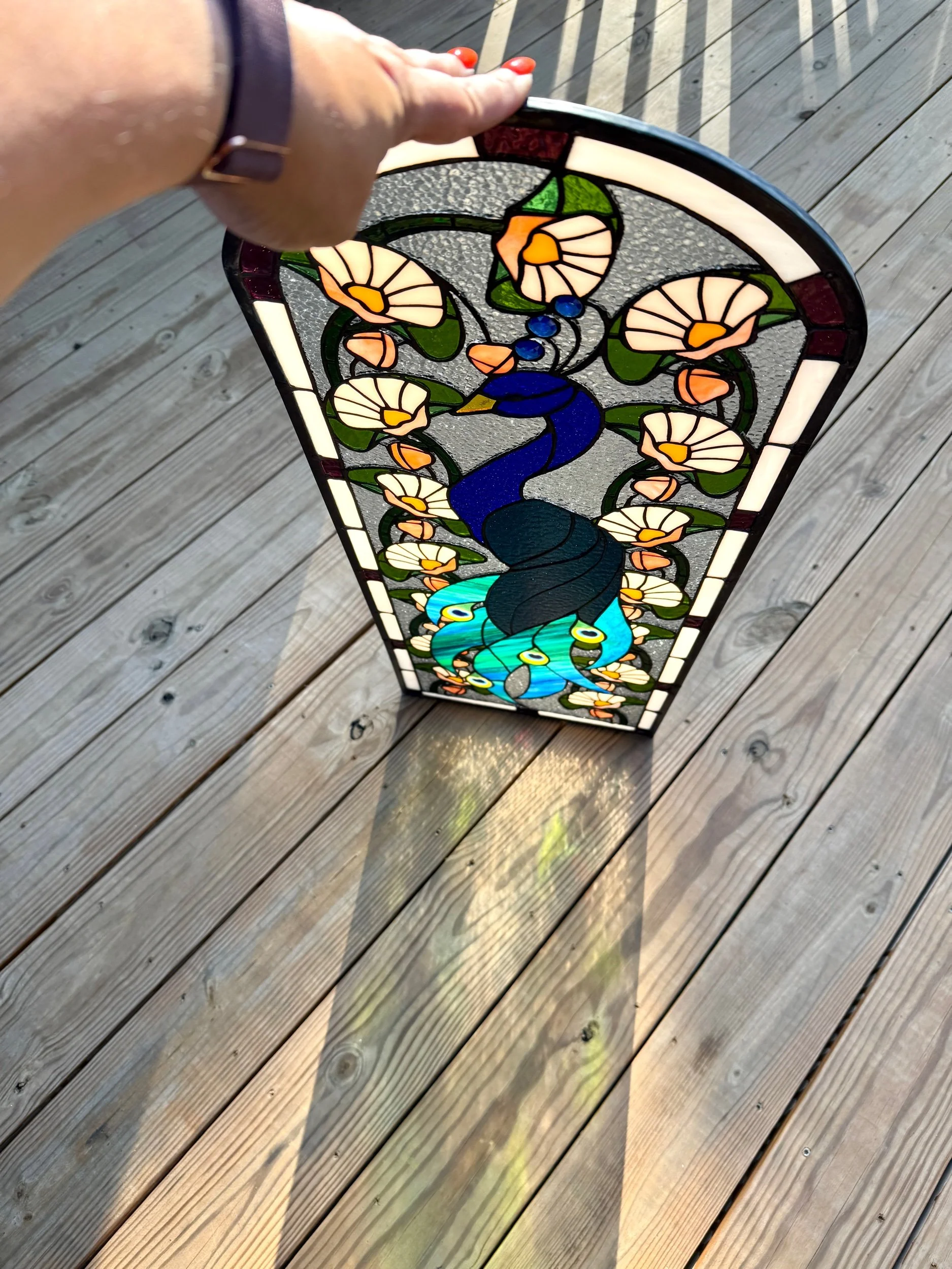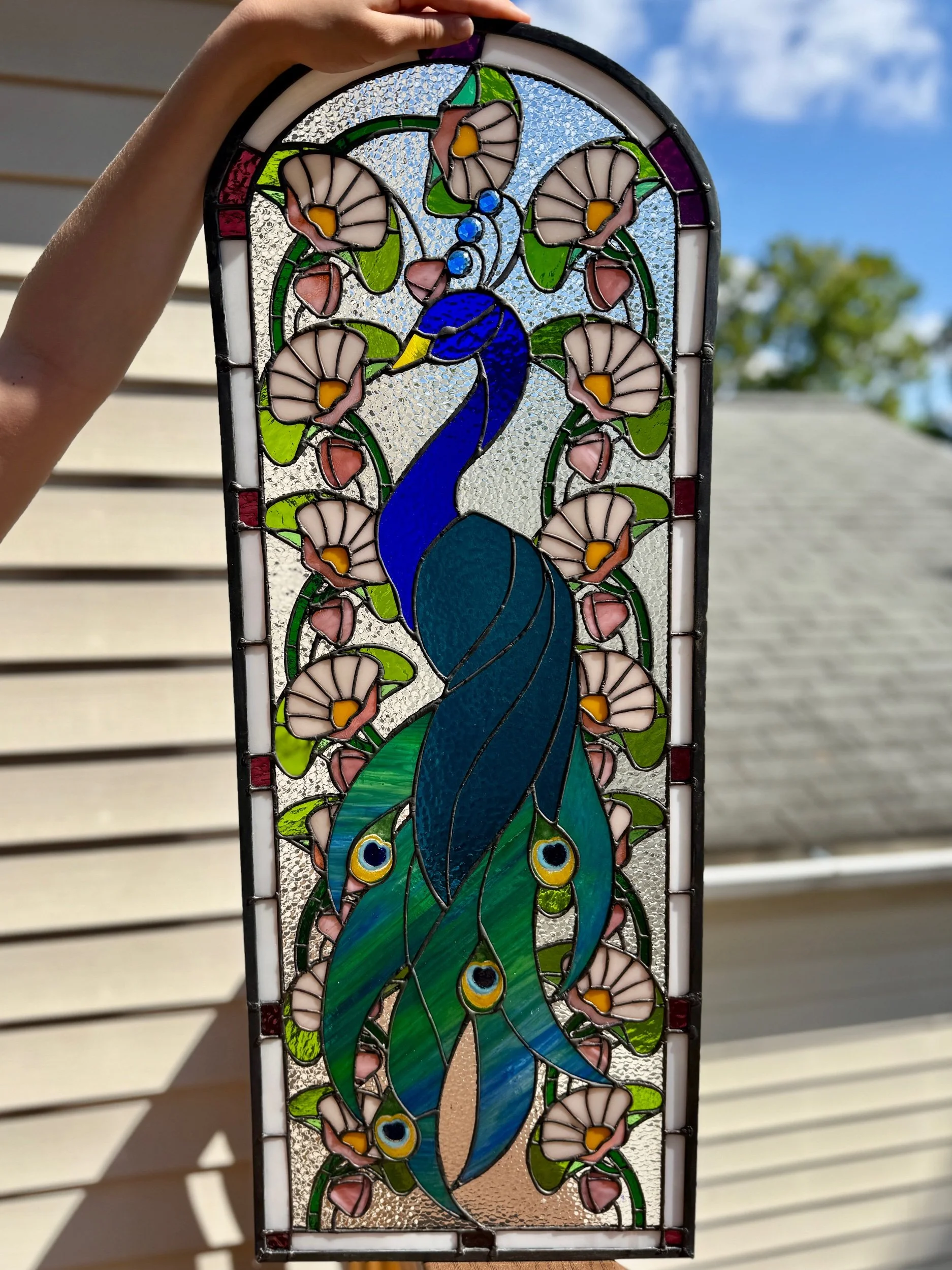 Beautiful peacock surrounded by flowers. Peacock feathers feature hand crafted fused glass. The peacock’s crest is finished off with beautiful multifaceted glass.