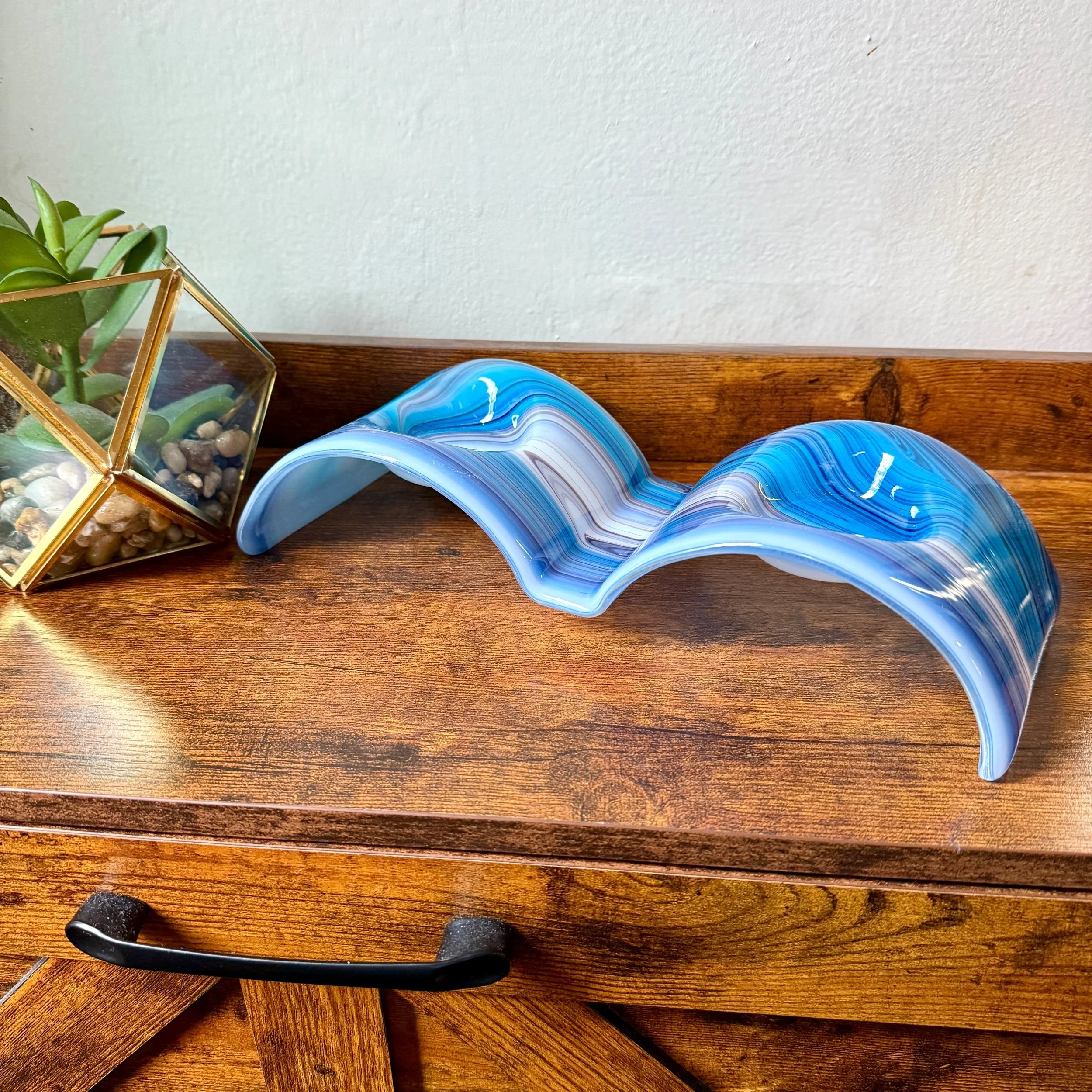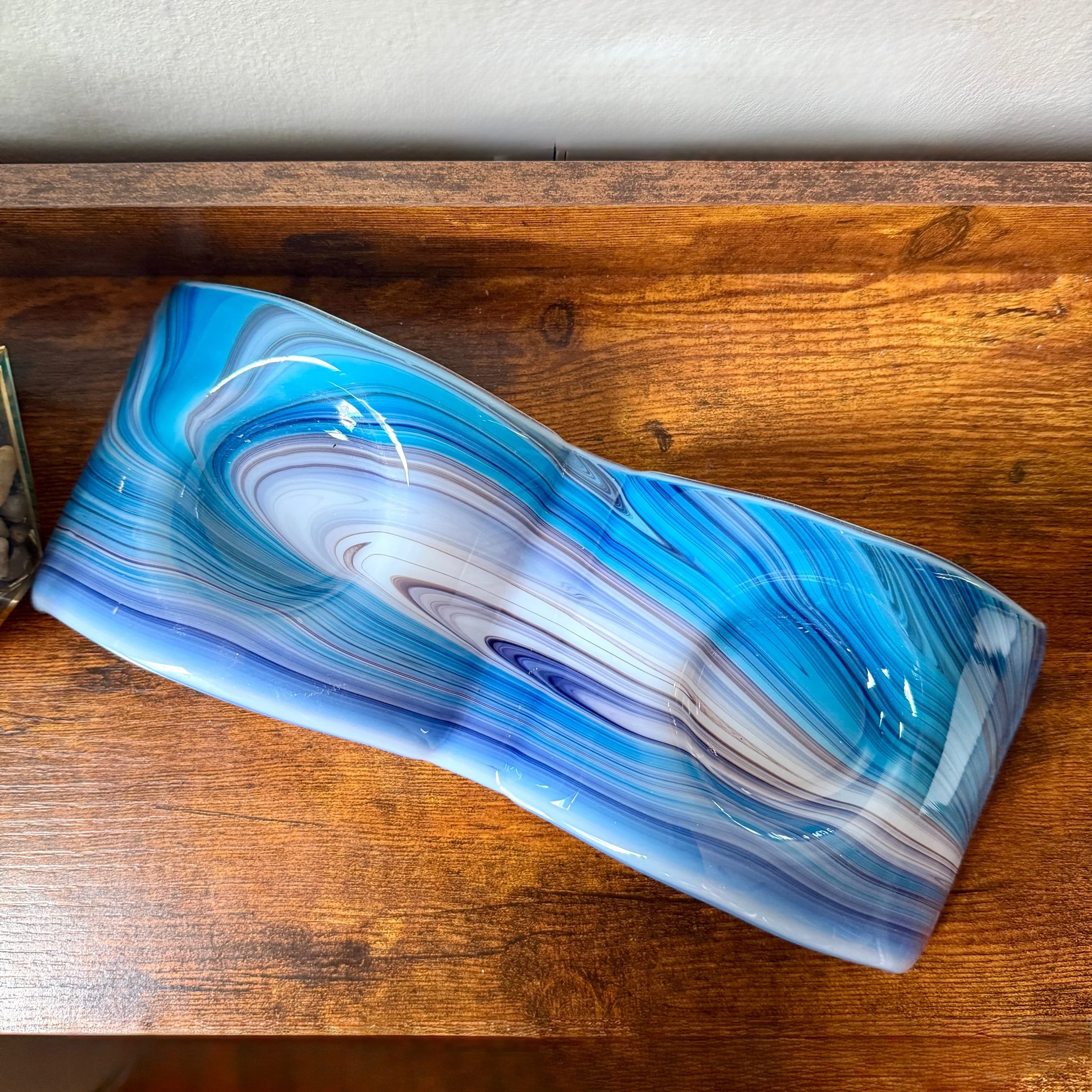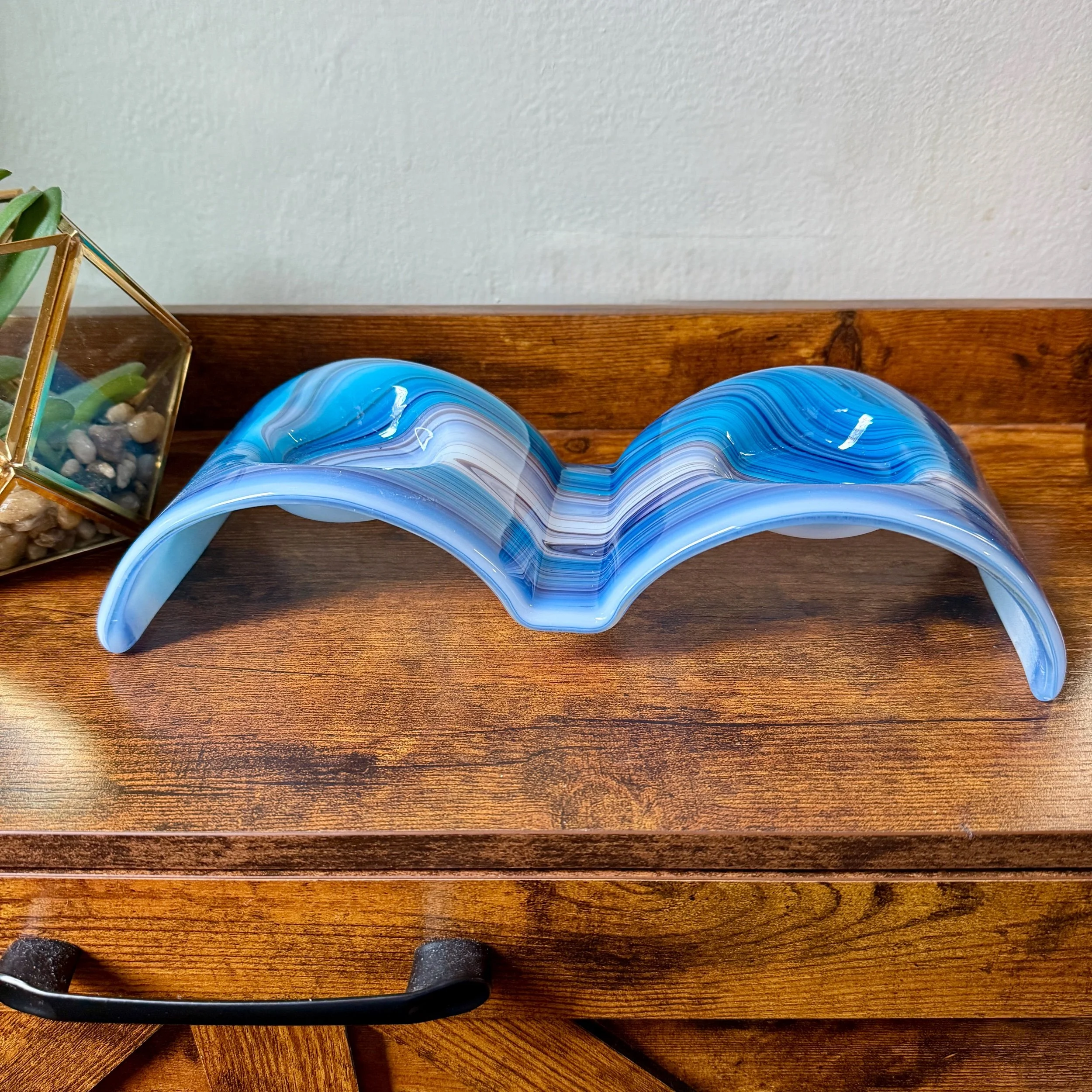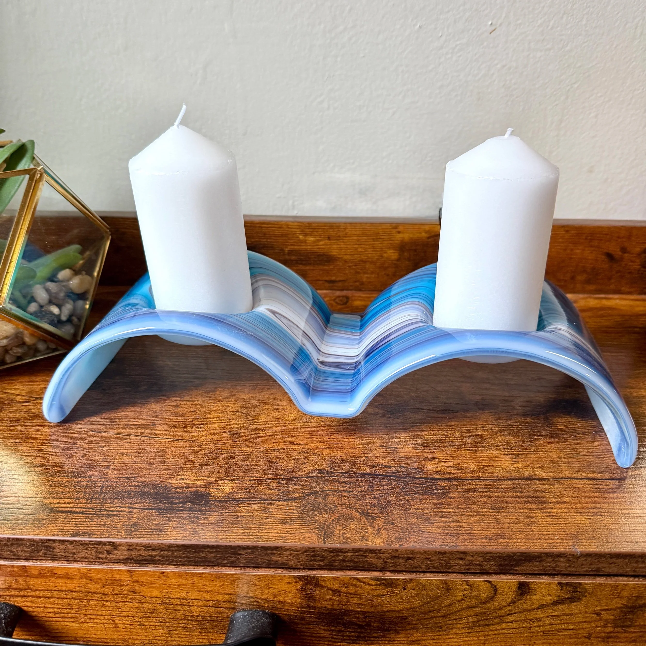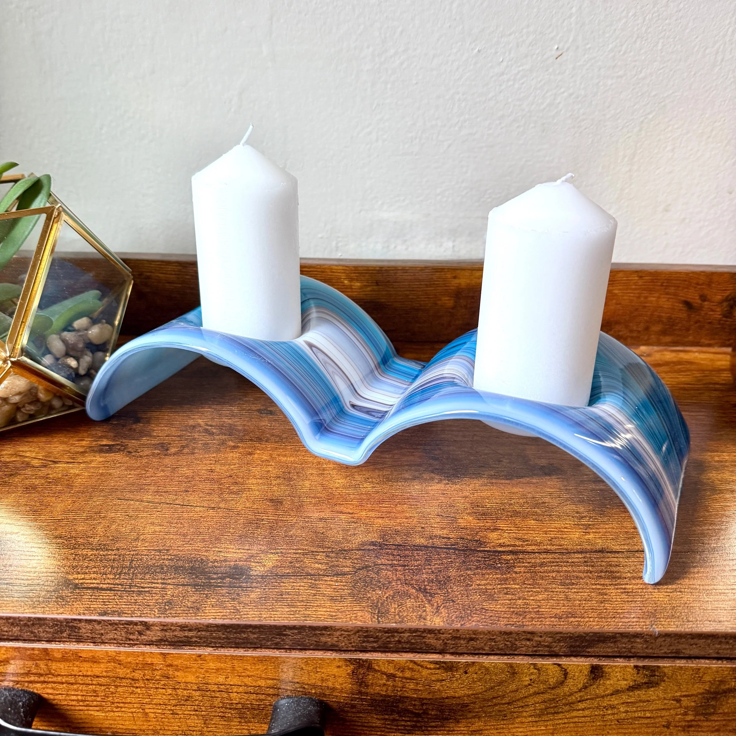 This fused glass candle holder can hold two candles that have a 2” diameter. It measure about 10” in length and 4” in width.