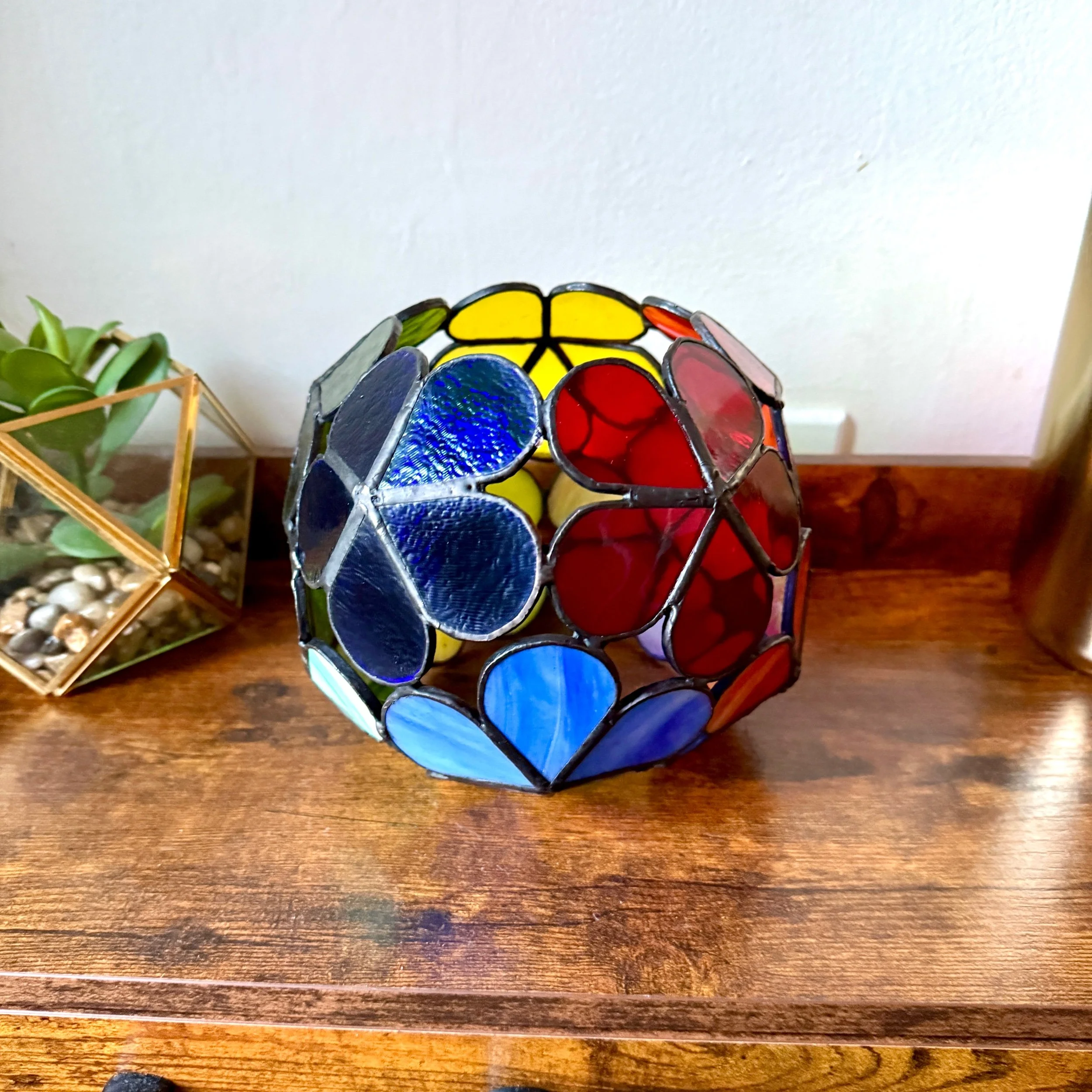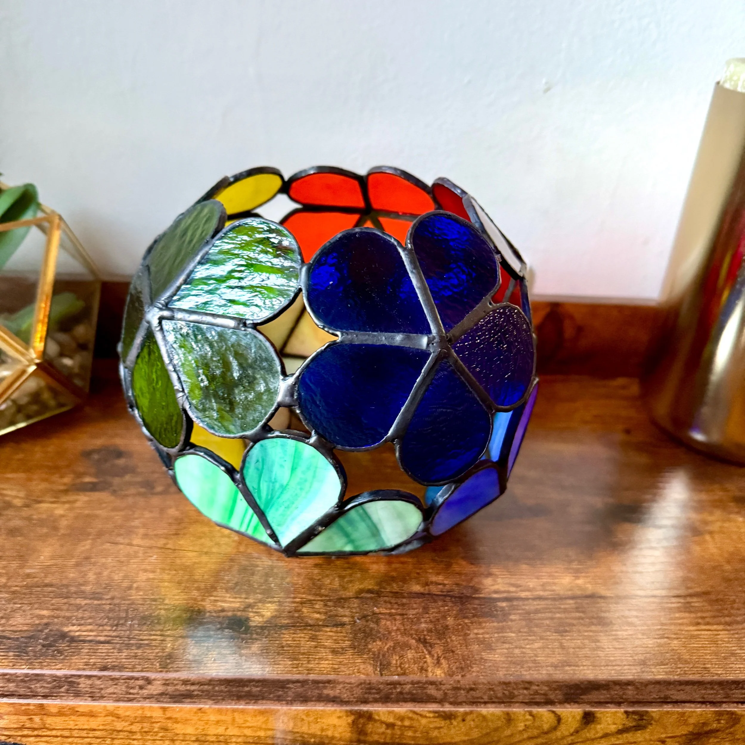 This lamp is in two piece. The flower globe is made with stained glass flowers in clear and opalescent multicolored glass. The wood base has an integrated LED light and come with 16 color modes and 4 flashing patterns, which can be switched easily with the included 24-key remote. The cable has an on and off switch and ends in an USB plug.