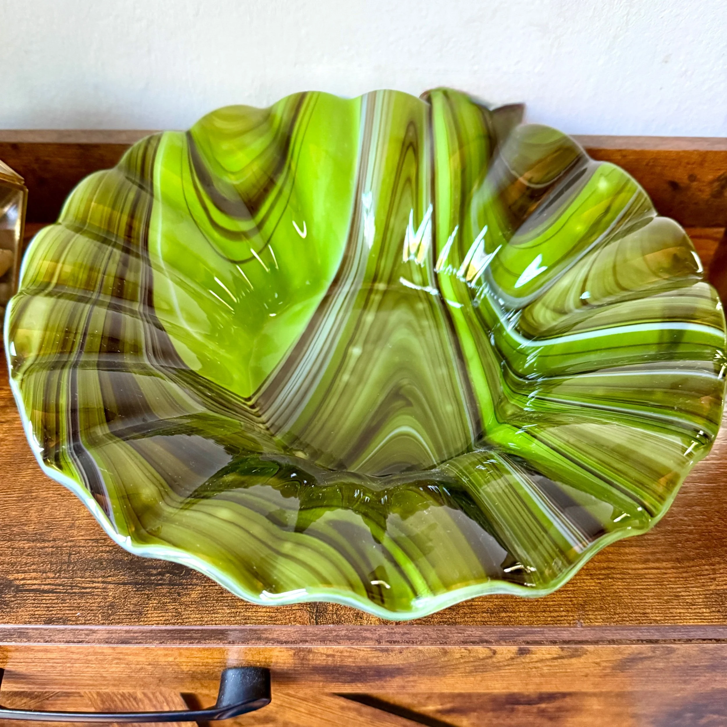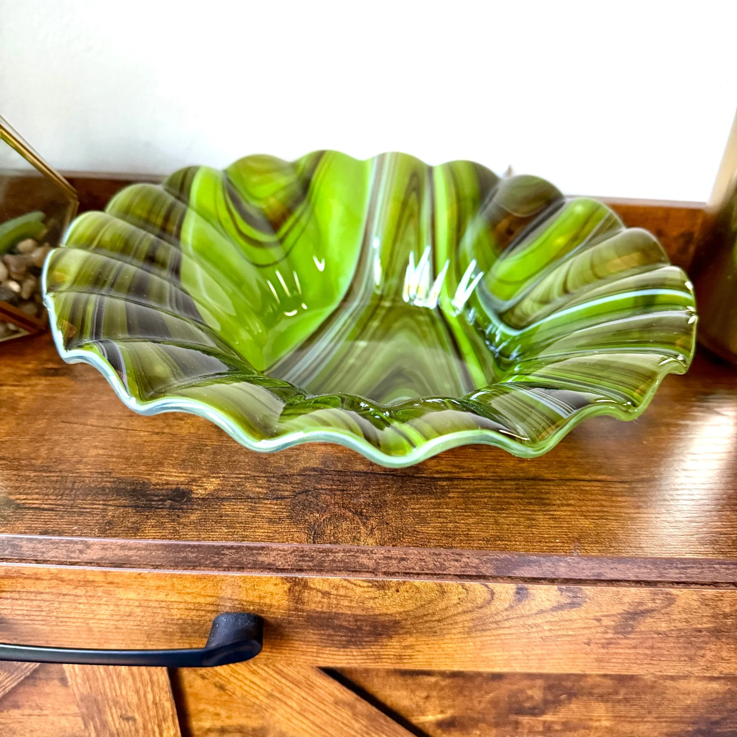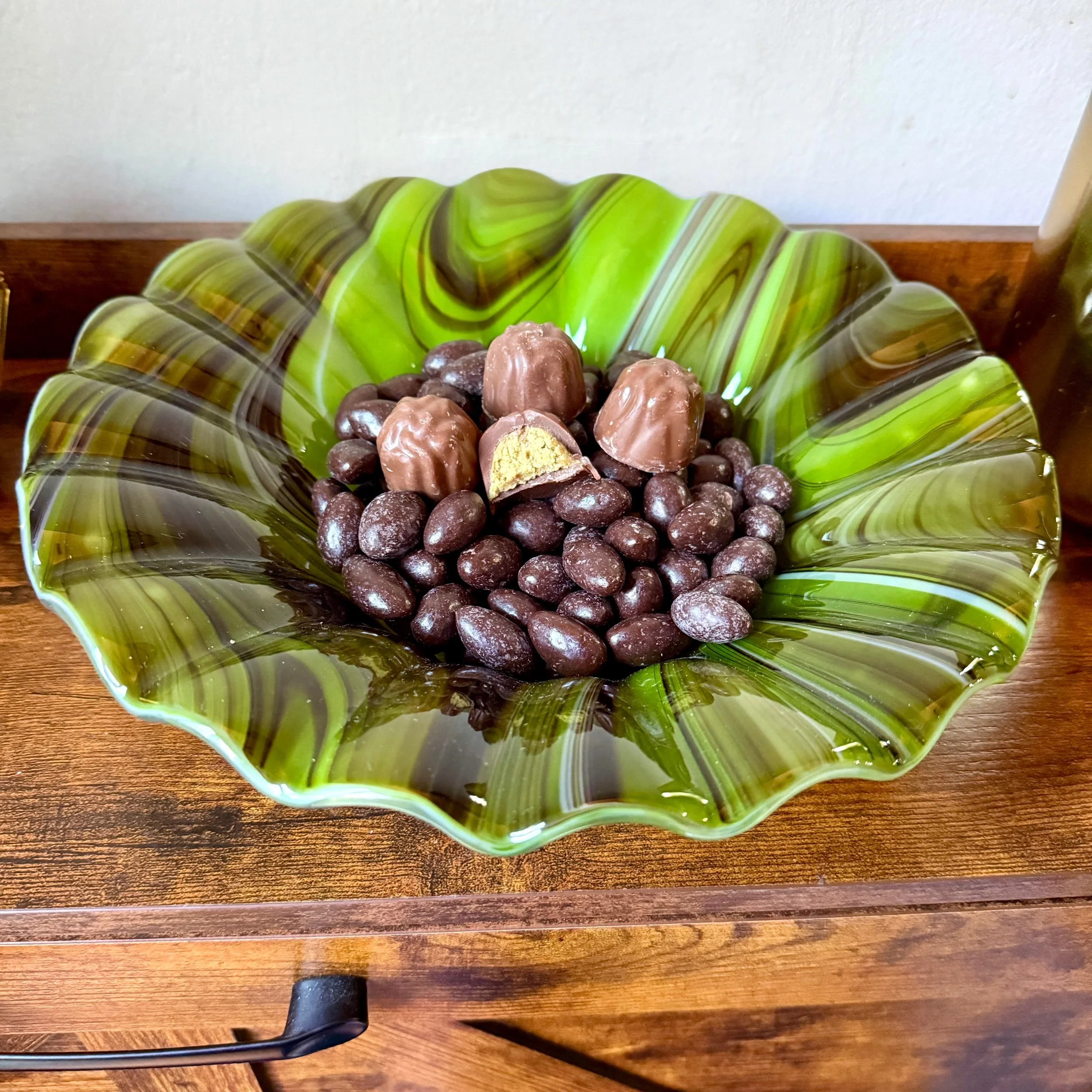 A Dubai chocolate bowl for your Dubai chocolates. Sometimes you just need to let the glass do the talking. This beautiful glass was made in a limited run by Oceanside Glass, emulating the newest fad in desserts, Dubai chocolate. Pistachio green and chocolate brown tones, it will be a great addition to any decor. It measures 10.5” wide and 2.5” high.